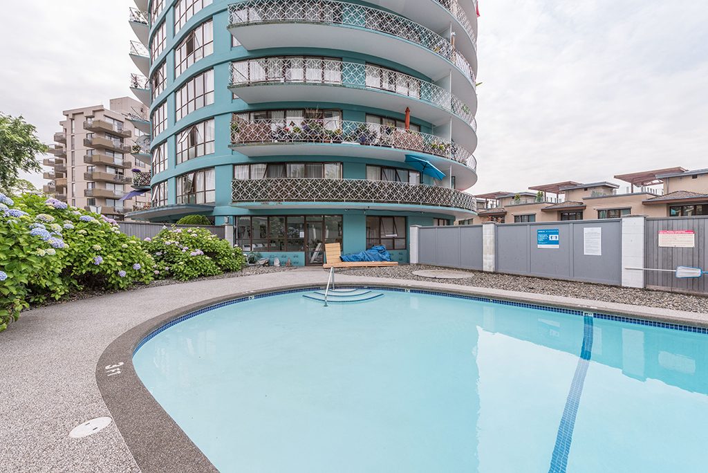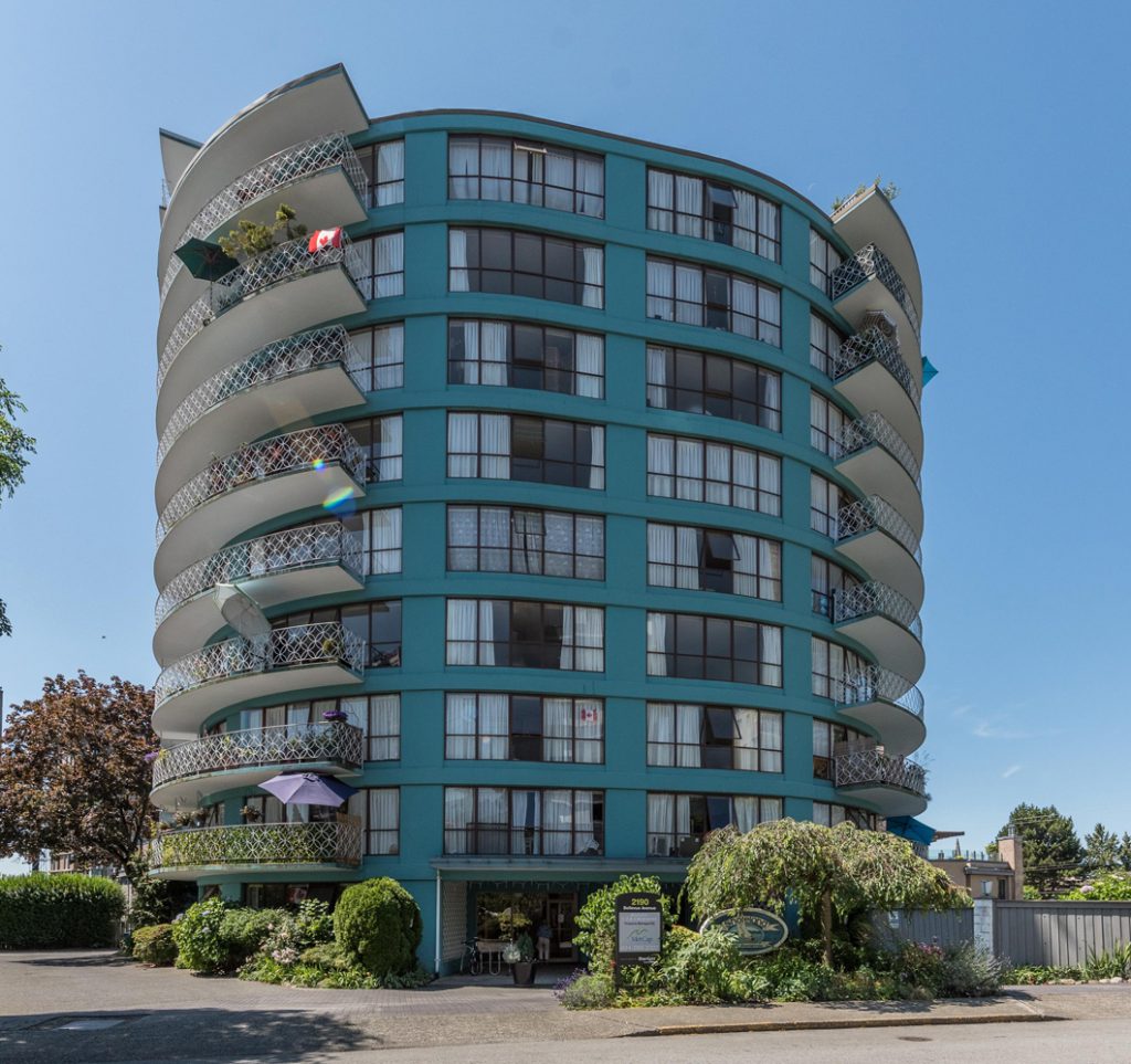 The Shoreland is located at the corner of 22nd and Bellevue Ave in West Vancouver at 2190 Bellevue Avenue, Vancouver, BC. This iconic, circular, turquoise high rise was designed by the architect after he returned from visiting Honolulu in the mid-1960s. Curved balconies with white balustrades and the rich blue green color make this building another unique landmark by the ocean in West Vancouver. The large, newly renovated bachelor, 1, 2 and 3 bedroom suites each have either sea or mountain views. Enjoy our beautiful outdoor swimming pool and pool deck. There is a laundry room off the pool area with a treadmill and recumbent bike and TV.Storage lockers are available.Heat and hot water are included.On-site outdoor parking is available. There is an entrance to the West Van Sea Wall right across the street. The West Van Aquatic, fitness, tennis and Senior community center is a five minute walk away, located on the corner of 22nd and Marine.Please schedule a personalized video call or tour to view available units and amenities by calling, texting or emailing our leasing agents.The safest way to find your new home.On-line options available at all properties for ease of rental payments, maintenance requests, and communication with property management – all accessible from your preferred personal device. Disclaimer – Photos, Video and 360 Virtual Tour for reference only, which give a general sense of unit layouts and finishes. Available units and prices may vary based on unit size, location, features, finishes, floor plan, and the occupancy date. Prices stated on the website are starting prices for each unit type, and are subject to change without notice. Errors & Omissions Excepted (E&OE).VideoMaps