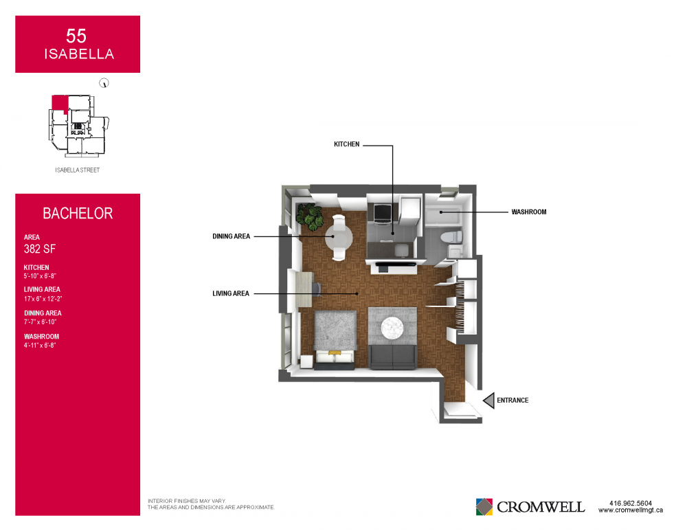 55 Isabella Street is centrally located in downtown Toronto, which is less than a 5 minute walk to Yonge and Bloor Street (Yonge and Bloor subway line). This offers convenient access to restaurants, entertainment, shopping (Eaton Center, Yorkville), Ontario government offices, University of Toronto, Ryerson, the financial hub and major hospitals.