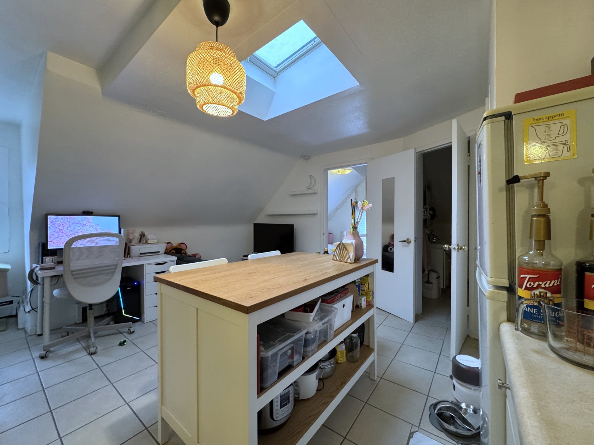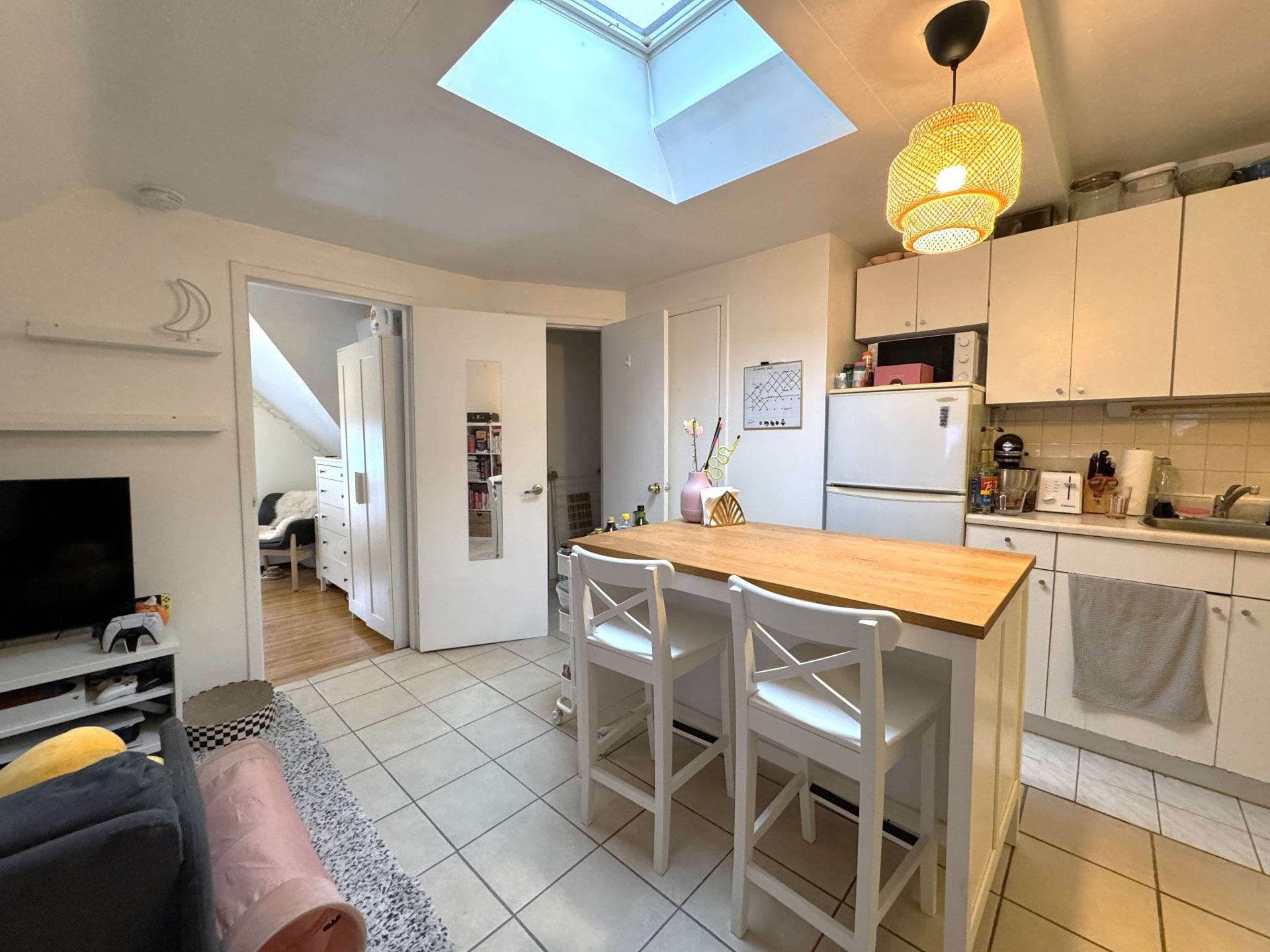 - Bright and Open Layout: Spacious open-concept living, dining, and kitchen area with a skylight for natural light