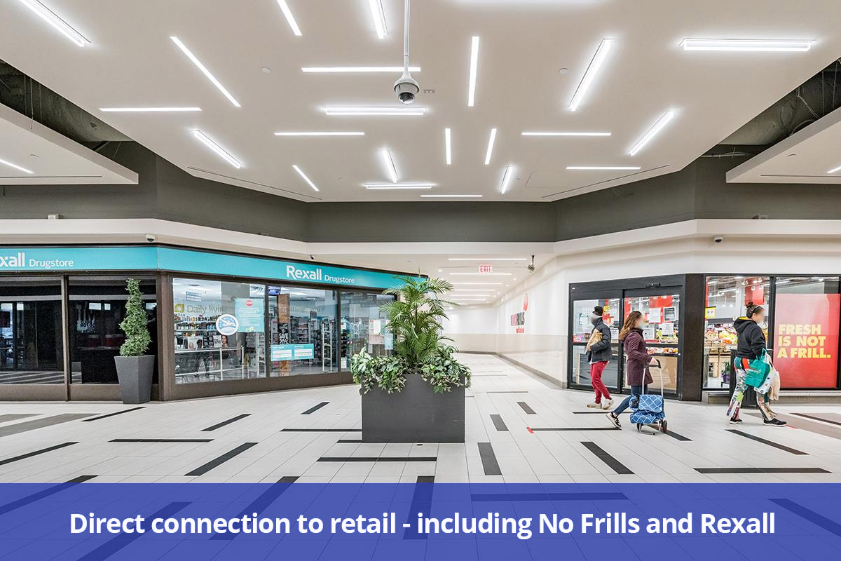 - Convenient mall attached to the building with: The Esquire Garment Care, Timothy’s Coffees, Pharma Plus Drugmart, Panzerotta & Pizza People, McDonalds, Rexall’s, No Frills, Post Office & Medical Office